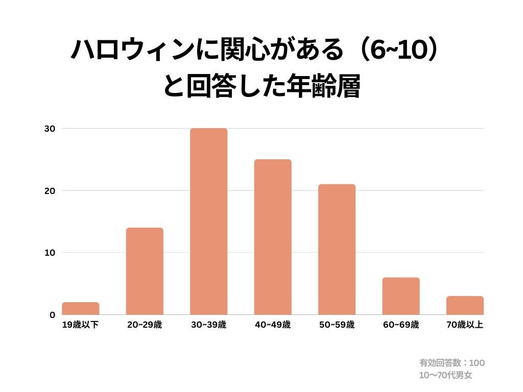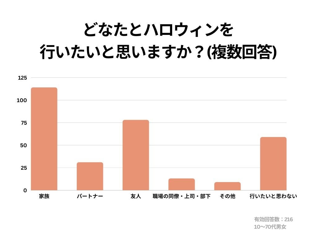 また、ハロウィンに関心を特に持っているのは30代~40代の比率が高いこともわかりました。どなたとハロウィンパーティを行いたいかと思うかという質問に対しては、家族の次に友人が多く、グループで楽しめるイベントという認識が強いと予想されます。