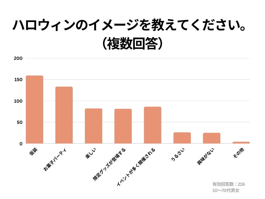 ハロウィンは秋の風物詩としても定着している結果に。また、ハロウィンのイメージを聞いたところ、「仮装」「お菓子パーティ」という実際のイベントのイメージをそのままに、「楽しい」という肯定的な結果が得られました。