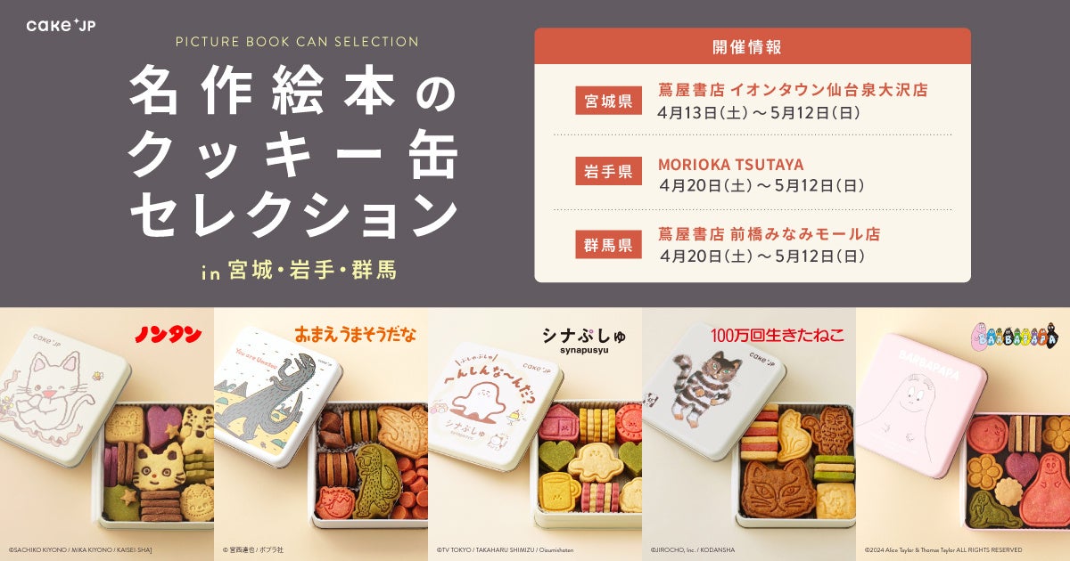 ケーキ・スイーツ専門通販サイト「Cake.jp(ケーキジェーピー)」を運営する株式会社Cake.jp(本社:東京都新宿区、代表取締役:高橋 優貴)は、4月13日から5月12日の間、宮城県・岩手県・群馬県の3県の蔦屋書店にて大人気のCake.jpと絵本がコラボしたオリジナルクッキー缶を購入いただけるポップアップストア「名作絵本のクッキー缶セレクション by Cake.jp」を期間限定で出店します。