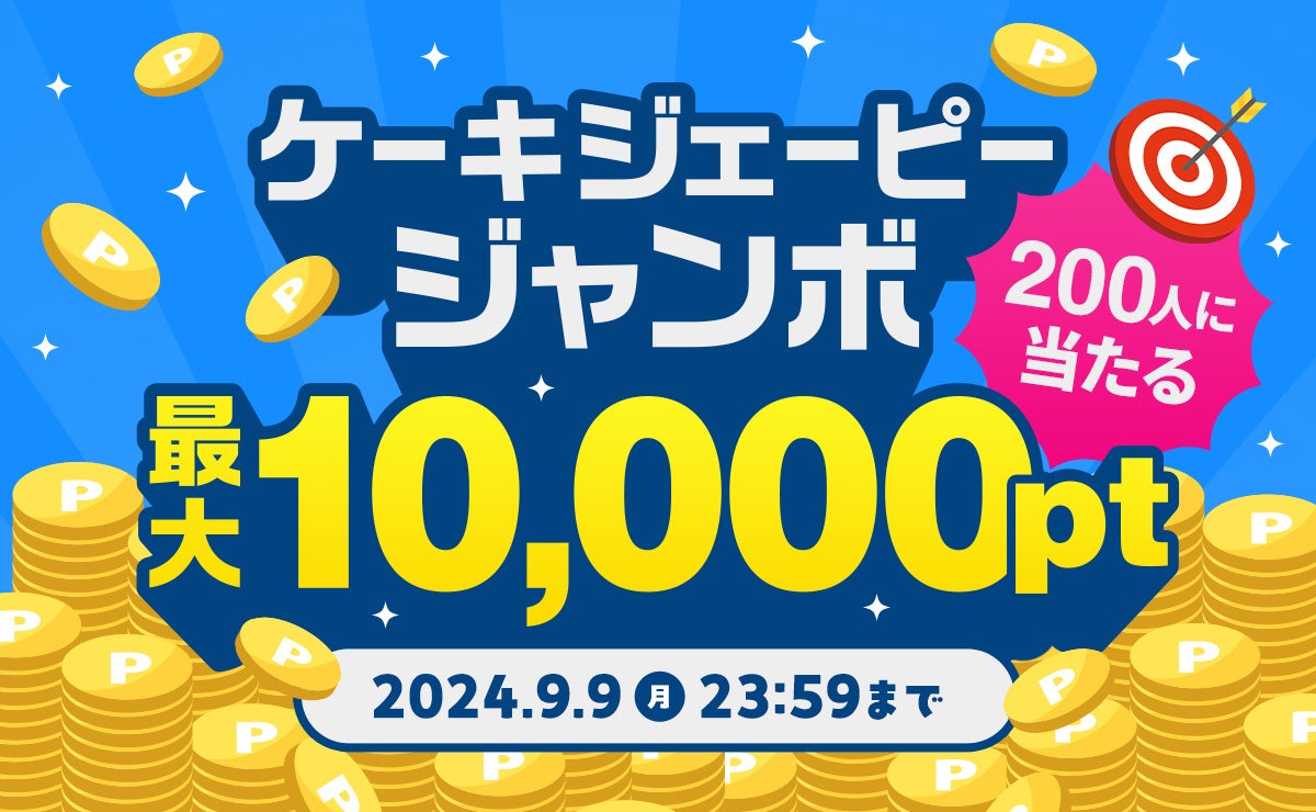 キャンペーン期間内にCake.jpで購入すると最大10,000ポイントが当たるケーキジェーピージャンボを開催します。9/12(木)までに当選ポイントをアカウントに付与いたします。