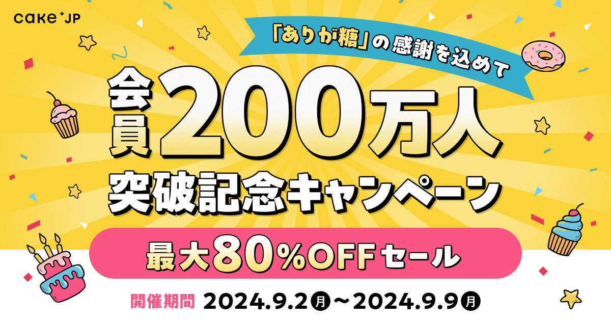 ケーキ・スイーツ専門通販サイト「Cake.jp(ケーキジェーピー)」を運営する株式会社Cake.jp(本社:東京都新宿区、代表取締役:高橋 優貴)は、会員200万人突破を記念して、2024年9月2日(月)12:00から9月9日(月)23:59まで、最大80%オフのセールなどお得な企画が目白押しの『会員200万人突破記念キャンペーン』を開催します。