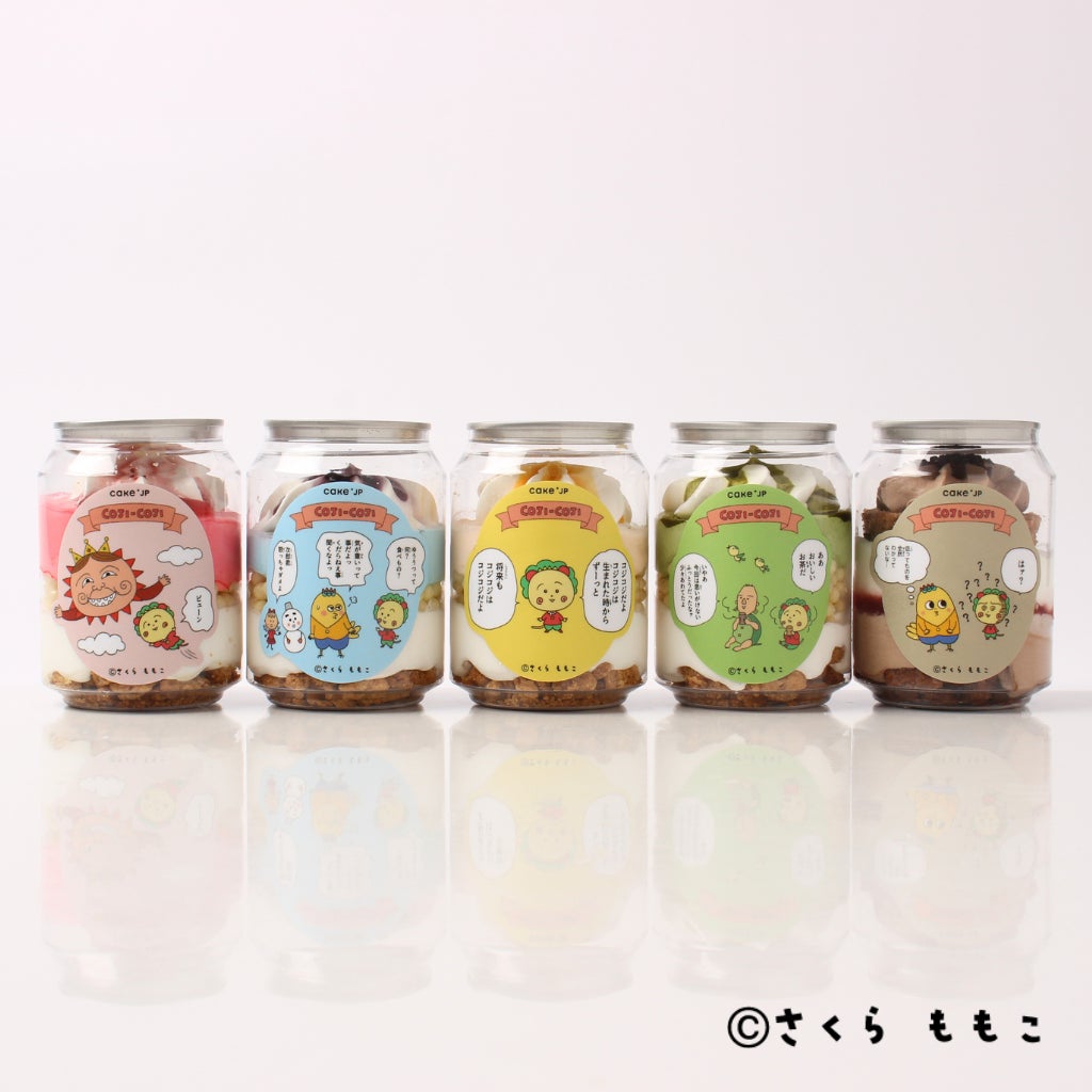 ケーキ缶のデザインは、全5種類!キャラクターそれぞれのイラストがケーキ缶のラベルシールになっており、このデザインはCake.jpコラボのためのデザインです。ケーキ缶のフレーバーは、いちご/ブルーベリー/マンゴー/抹茶/ダブルチョコレートをご用意しております。