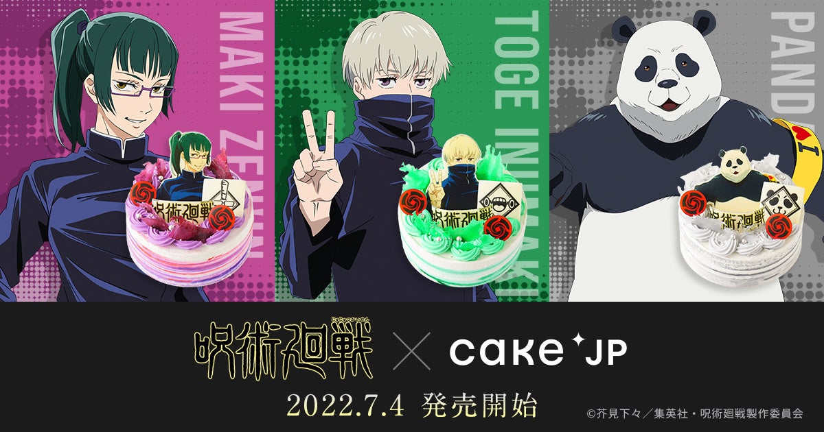 ケーキ・スイーツ専門通販サイト「Cake.jp(ケーキジェーピー)」を運営する株式会社Cake.jp(本社:東京都新宿区、代表取締役:高橋 優貴)は、大人気TVアニメ『呪術廻戦』とのコラボ商品として、TVアニメに登場する東京都立呪術高等専門学校二年生のキャラクターをモチーフにした3種類のオリジナルケーキを7月4日(月)より販売開始します。